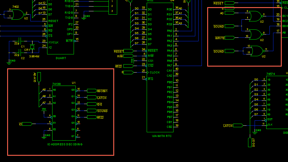 The initial goal was (and is) to implement the glue logic for the IO “half” of the computer in a CPLD. This includes the IO decoder enable generator as well as the AY-3-8912 glue. In other words, these bits of the circuit: