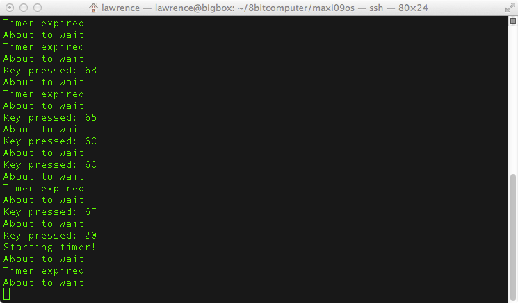 The top of the screenshot shows the periodic (one second) timer expiring a couple of times. Then I typed h, e, l, l, o and finally space (20 hex), which turns the timer into a 5 second non repeating timer.